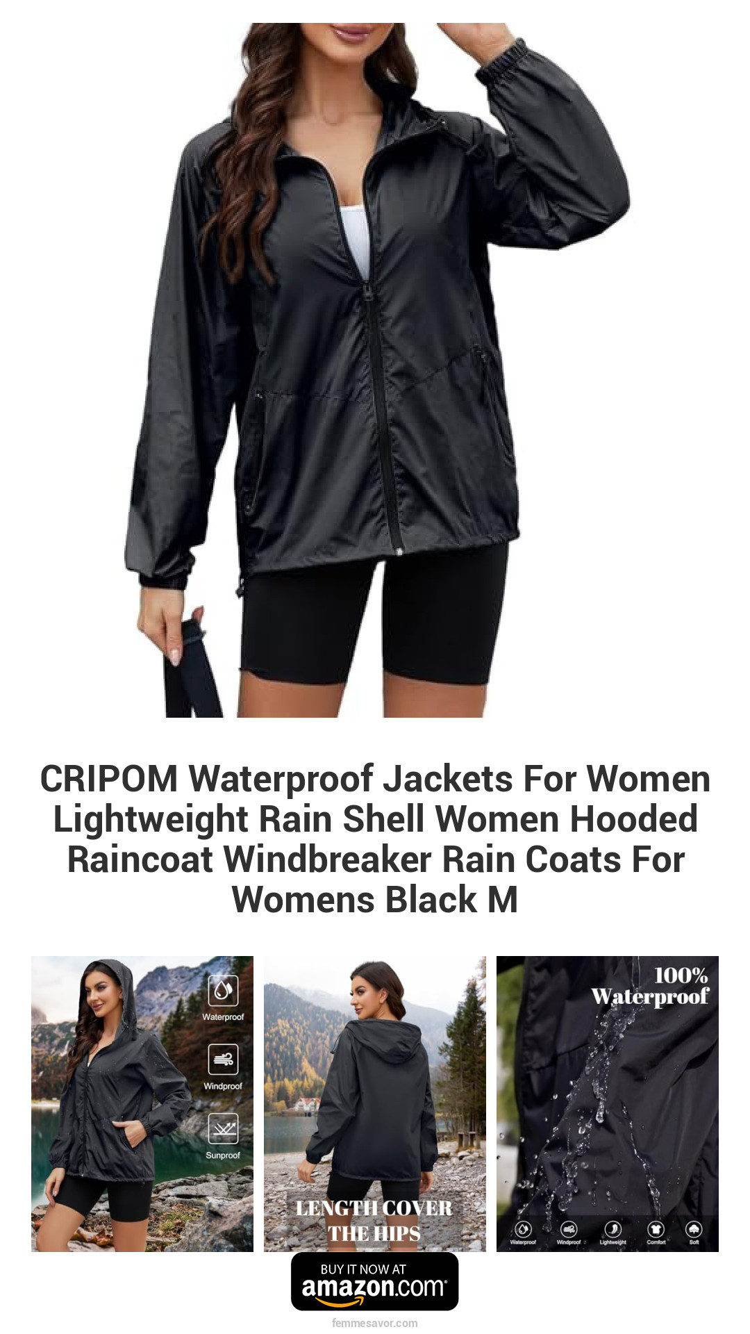 CRIPOM Black Waterproof Jacket for Women – Lightweight, Stylish, and Versatile Hooded Raincoat in Medium Size