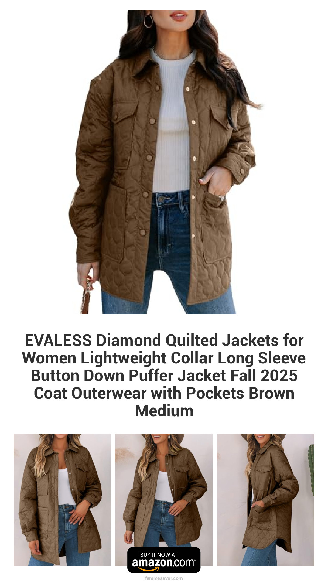 EVALESS Diamond Quilted Jackets for Women Lightweight Collar Long Sleeve Button Down Puffer Jacket Fall 2025 Coat Outerwear with Pockets Brown Medium