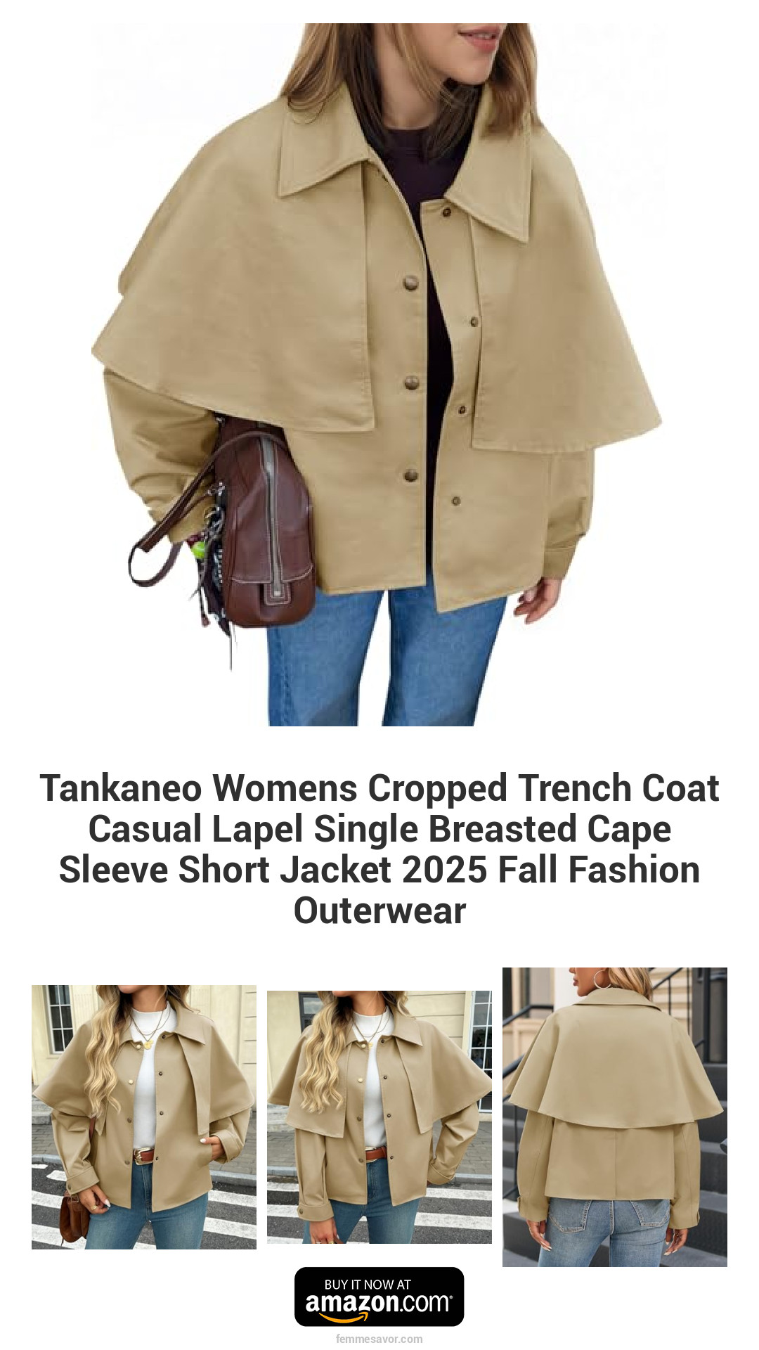 Tankaneo’s Stylish Khaki Cropped Trench Coat with Cape Sleeves for Fall Fashion 2025