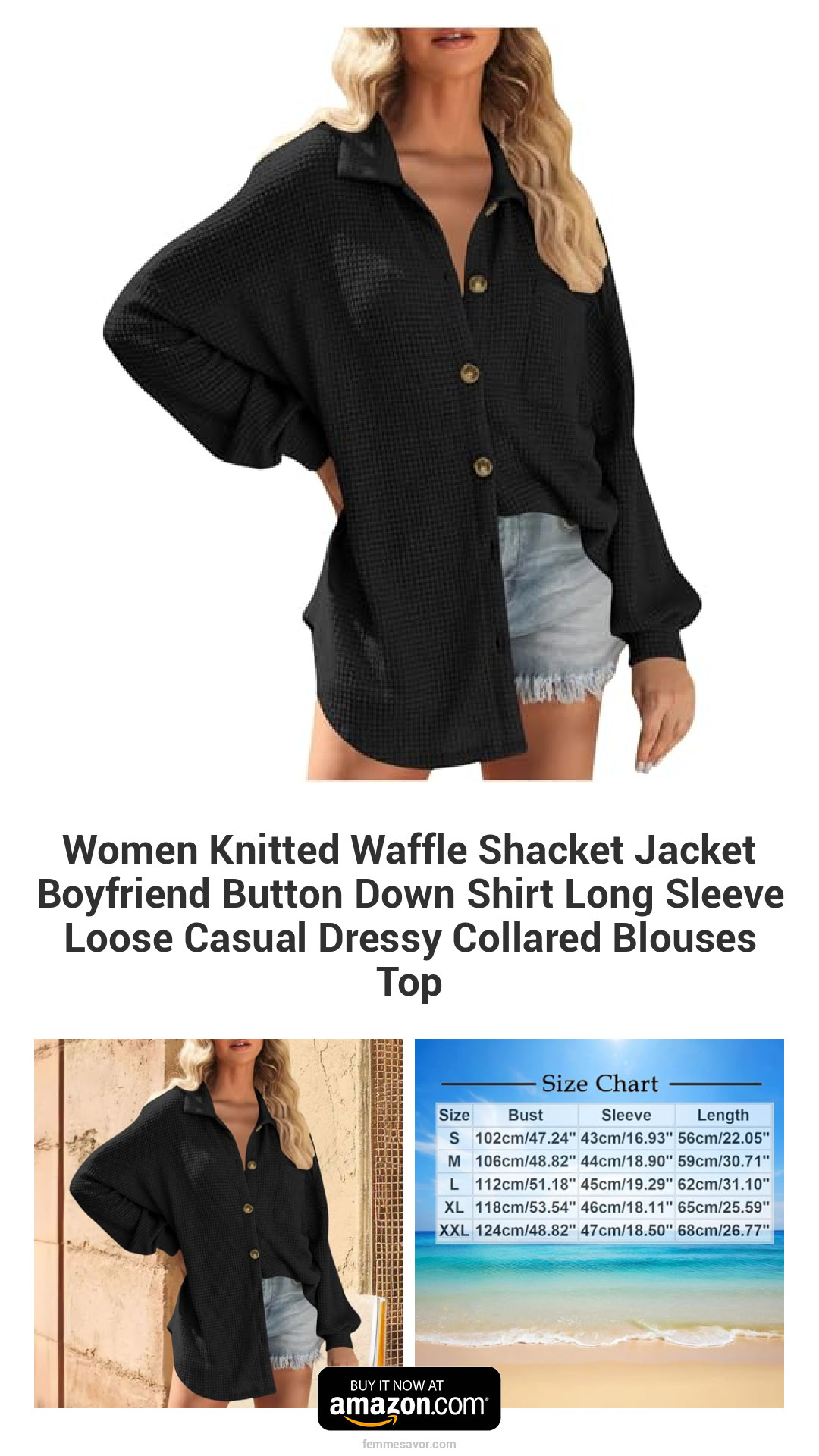 Picture this: a chilly fall morning, the kind where the leaves crunch underfoot, and there’s a hint of frost in the air. You’re snug in this black, long-sleeve, button-down beauty. It’s got this loose, laid-back fit that’s just perfect for layering over your favorite tee or that go-to dress you’ve worn a million times. The texture? A waffle knit that’s somehow both casual and classy. Magic, if you ask me.