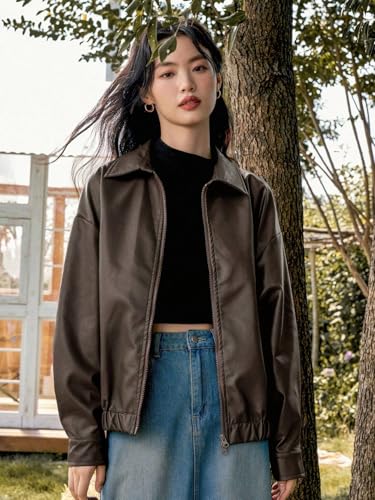 So, the key? It’s this brown drop shoulder women’s Fall Winter jacket that’s just the right amount of loose fitting. Picture this: you throw it on over a simple white tank, and boom! Instantly chic. The PU leather? It feels so luxurious but also has this casual vibe that makes it perfect for coffee dates or just lounging with friends. Seriously, it’s like the best of both worlds.