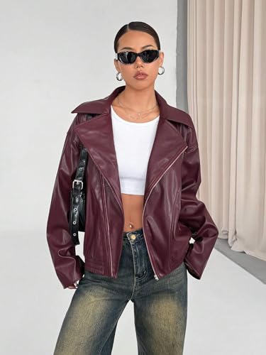 This Burgundy PU Leather Jacket is everything. The color? Oh, honey, it’s just perfect for fall. Deep, rich, and seriously eye-catching. And let’s talk about the way it fits. It’s designed to be a loose fit, and it takes the pressure off, gives you room to breathe, but still creates a sleek silhouette. Like, I’ve worn it over a solid crop top and the way it drapes just feels right.